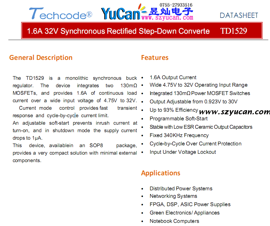 TD1529 寬電壓1.6A同步降壓整流芯片